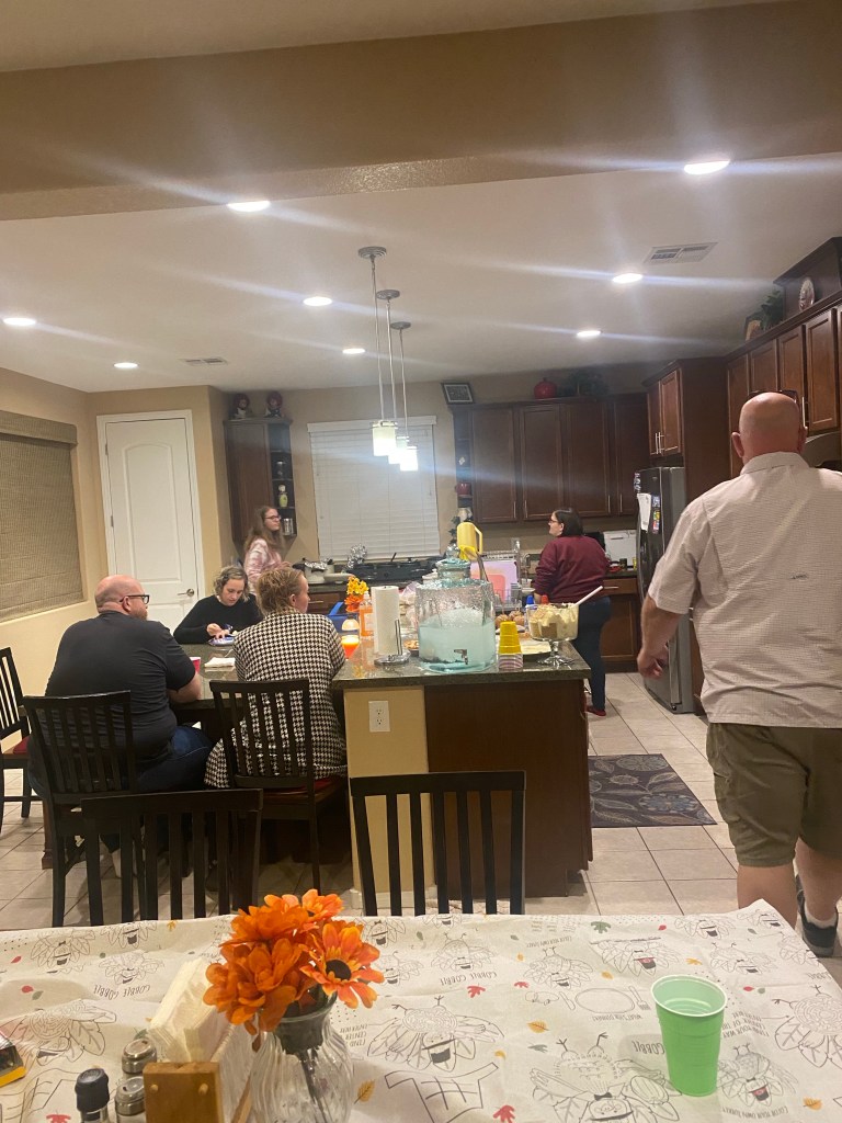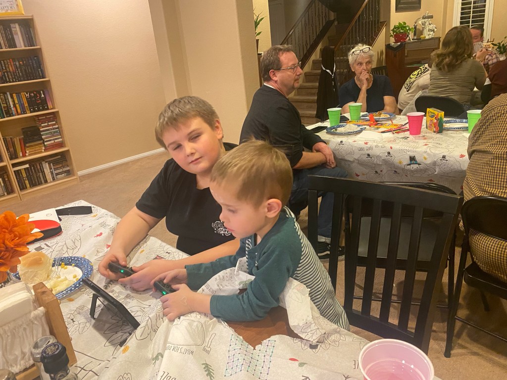 Our Thanksgiving dinner was at Anthony’s brother, Greg’s house this year. Greg is the baby of the family, and he has a huge house! Greg has two young kids, Lailaa (13) and Levi (8). His wife, Becky’s parents live with them in an attached suite. They have a huge living/ dining area, and it worked out perfectly to have tables and chairs set up for a very nice dinner. Greg and Becky put paper tablecloths with Thanksgiving coloring pictures and crayons on the tables, and everyone brought food! So much food! it was definitely a feast! Afterwards, the kids played games and we had music from Amanda. Annalyse. Ginger and Laila! Thanksgiving dinner was very nice.