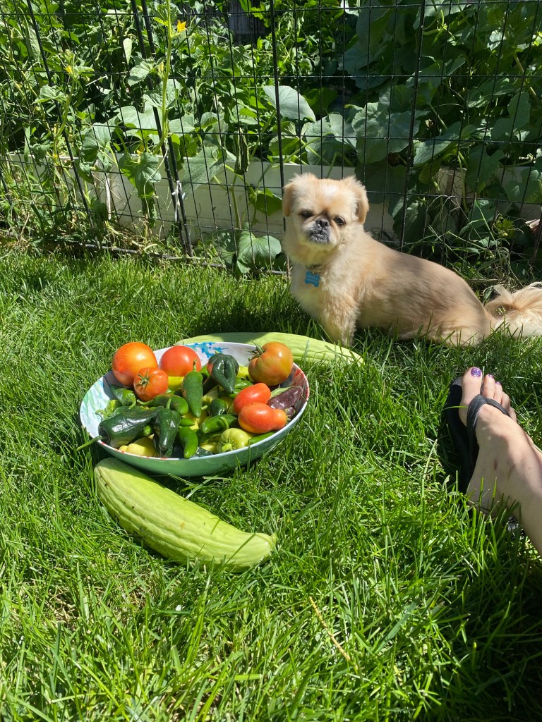 It is August and harvest time for us Idaho people! It’s a beautiful, sunny day here, and I am addicted to sunny days and flowers, and today had both! Such goodness! I went into my little backyard garden to have a look at what was ready for me to pick! My dogs and I found some good stuff! We found two very large Armenian cucumbers, lots of peppers and a few tomatoes! Who doesn’t love some freshly picked vegetables to eat? LMy Amanda, who is back from Scotland and done with her Master’s Degree work, is a great cook! She immediately pulled some peppers and tomatoes from my large bowl, and put them into her roast! We are going to have some delicious shredded beef tacos tonight! Yummmmmm… Harvest time is filled with GOOD, yummy food! GOOD food, GOOD family… who could ask for more?